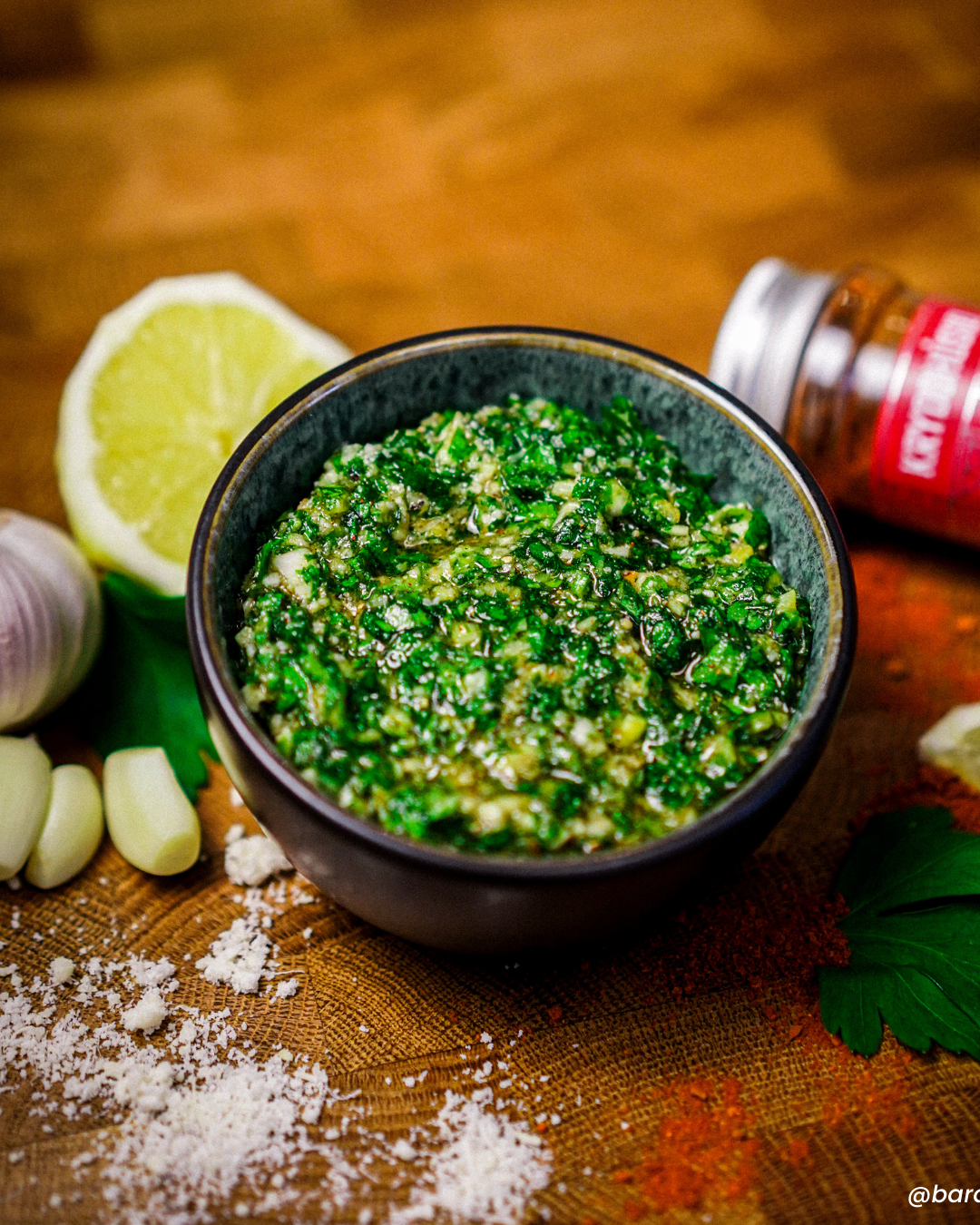 Takið stönglana af steinseljunni og saxið smátt og setjið í skál.
