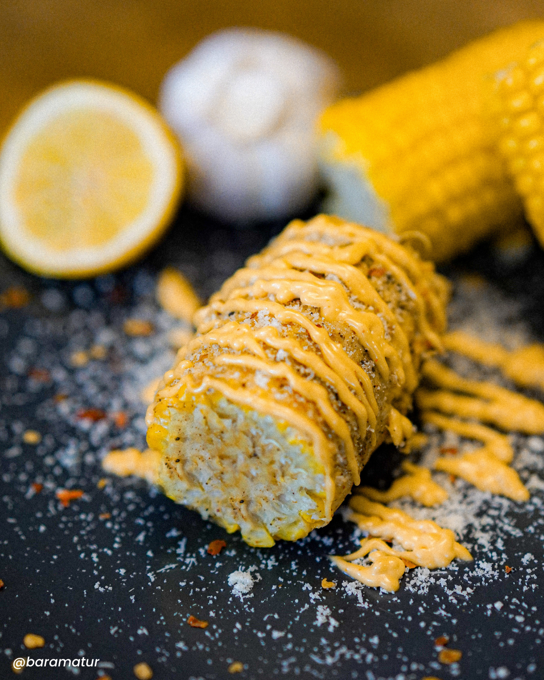 Stráið svo parmesan og kryddblöndunni yfir maísinn og kreistið smá sítrónusafa með.