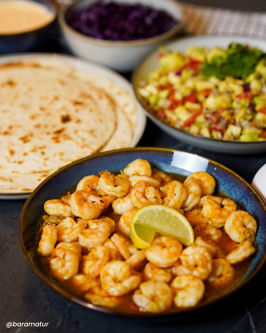 Saxið 3 hvítlauksgeira og setjið í skál með rækjunum, ólífuolíu og kryddi að eigin vali.